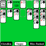 フリーのクロンダイク。 PalmOS3.5以上用。 クロンダイクが遊べる、ごく一般的な作りのゲームです。 画面左上のカードの山について、1枚ずつ開くか3枚単位で開くかを選択できます。 一番の特徴は、スタイラスだけでなく4つのハードボタンでも遊ぶことができる点。 その時点でカードの列を動かせる箇所があればアドレス/ToDoボタンで移動させることができ、予定表/メモ帳ボタンで場からカードを引いたりできます。 Palmのソリティアは操作にスタイラスを使うのが一般的なので、ハードボタンでも遊べるのは珍しいと思います。 | |