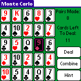 隣り合った同じ数のカードを消していくソリティアゲーム。 ゲーム開始時、5×5のフィールドにカードが配られます。 その中から、縦横斜めのいずれかに隣り合う同じ数字のカードをタップして取り除きます。 この要領でカードをすべて取り除くことができればクリアです。 このゲームの特徴は、カードを取り除いた後、残りカードの補充方法を選べることです。 1つは、画面右にある「Deal」(空きにカードを配る)と「Combine」(空いている場所を詰める)を使って手動で場を整える方法。 もう一つは空きができたら上記2つを自動でしてくれる方法です。 この2つの方法をメニューの「Setting」で変えることができます。 一般的にはカードの補充が自動になっているソフトが多いので、手動でできるのは珍しいです。 手動の場合は「Deal」と「Combine」を行うタイミングも考えなければならず、自動補充にはない別の楽しさがあります。 CLIEやHandEra330、OS5のハイレゾに対応しています。 | |