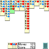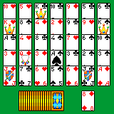 オーソドックスなソリティアゲーム。 画面右の場にAからKまでマークごとに並べていきます。 真ん中の場で、数字の大きい方から順に、マークを赤黒交互に置いていけるのは一般的にソリティアと呼ばれているものと同じです。 ただし、一枚も無い列にはKだけでなく何でも置けます。 場で何もできなくなったら画面左の山から1枚取ります。 山から取れるチャンスは1巡のみです。 購入版では52枚で4列作る、104枚で8列作るという2つのモードが選べるようです。 また、タイムアタックも記録されるようです。 (試用版は52枚で遊べるだけでした) [2009/11/01追加]ダウンロードできなくなっているようです。 | |