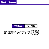 バックアップツール。 外部メモリーカードがある機種専用です。 メモ帳/ToDo/予定表/アドレスのデータを電源オフ時にバックアップする機能(後で紹介している「PowerOff Backup」と同等)と、定時バックアップ機能があります。 PalmOS5の機種では本体のバッテリが減ってきて警告を発するレベルにまで電圧が下がった時にも自動的にバックアップしてくれます。 バックアップ対象ファイルはいわゆるバックアップビットが立っている可視属性ファイルですが、外部メモリーカード上にクリエータIDなどをCSV形式で保存しておくとそのファイルもバックアップしてくれます。 詳しくはマニュアルを参照してください。 | |